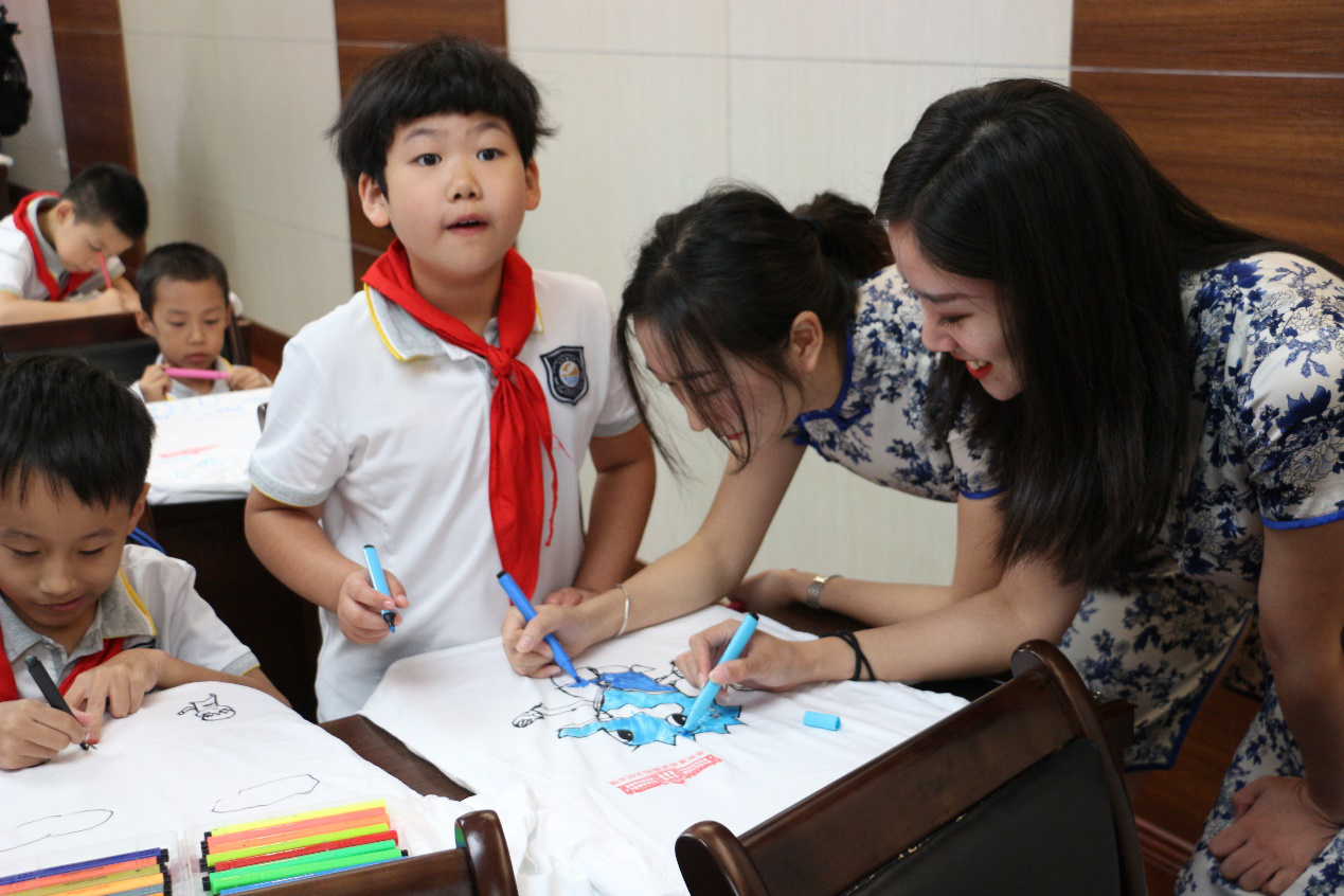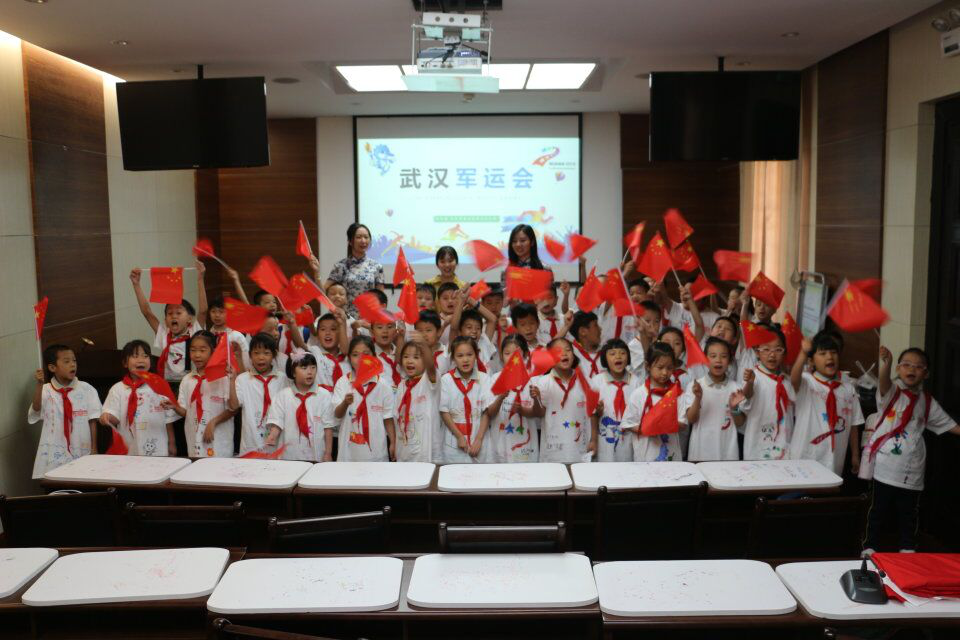 课程结束后,同学们在印有辛亥革命武昌起义纪念馆logo的空白文化衫上绘制了军运会相关元素的图案,有的同学画了吉祥物“兵兵”,有的画了国旗,还有的写了口号,同学们的绘画内容丰富又创意十足。最后同学们穿上自己绘制的文化衫,戴好红领巾,挥舞着小国旗,齐唱《歌唱祖国》,为祖国庆生,为军运会加油!