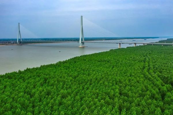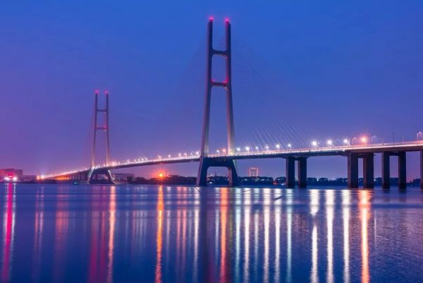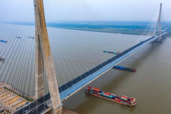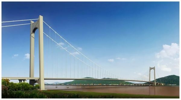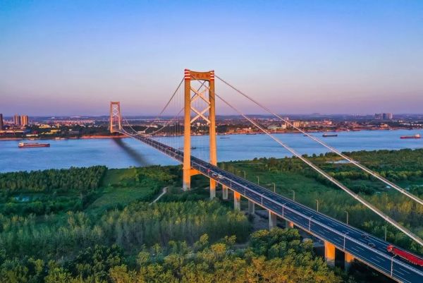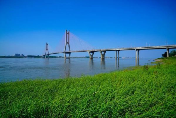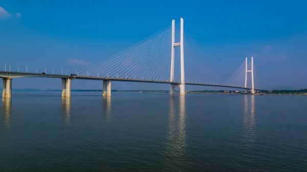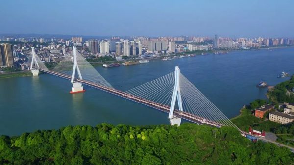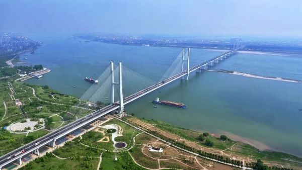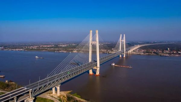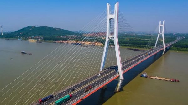 荆岳长江公路大桥,桥型为双塔钢箱梁斜拉桥,是首座连接湖北、湖南两省的长江大桥。