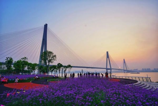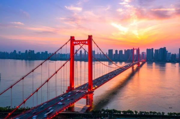 鹦鹉洲长江大桥是武汉第8座长江大桥。主缆曲线构成的轮廓简洁、轻盈,富有韵律美,高耸的三塔寓意着武汉“三镇”鼎立。橘红色的桥身,成为江城一道靓丽的风景线,被称为武汉最美的长江大桥。
