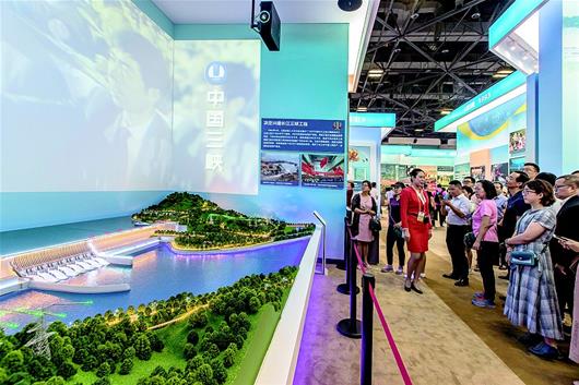 图为:9月24日,“伟大历程 辉煌成就——庆祝中华人民共和国成立70周年大型成就展”首次对公众开放。图为观众在三峡工程展台前聆听讲解员讲解。 (湖北日报全媒记者 梅涛 摄)