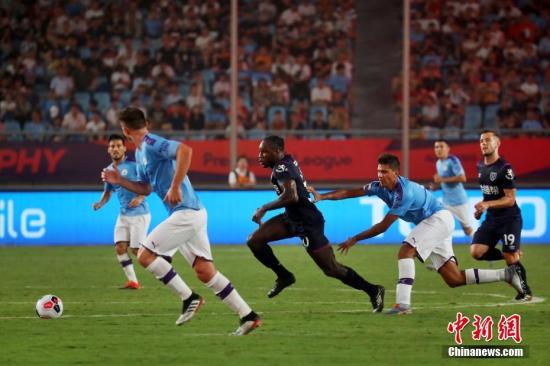 资料图:7月17日晚,在南京举行的2019英超亚洲杯比赛中,曼城队(蓝色上衣)4比1战胜西汉姆联队(黑色上衣),将与狼队在上海争夺最终的冠军称号。中新社记者 泱波 摄
