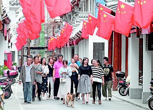 9月24日,襄阳古城街头五星红旗迎风飘扬,古色古香的樊城区鹿角门社区古巷中,家家户户门前悬挂五星红旗将古巷装扮得喜气洋洋。随着国庆佳节的临近,我省城乡喜迎新中国成立70周年的氛围越来越浓。