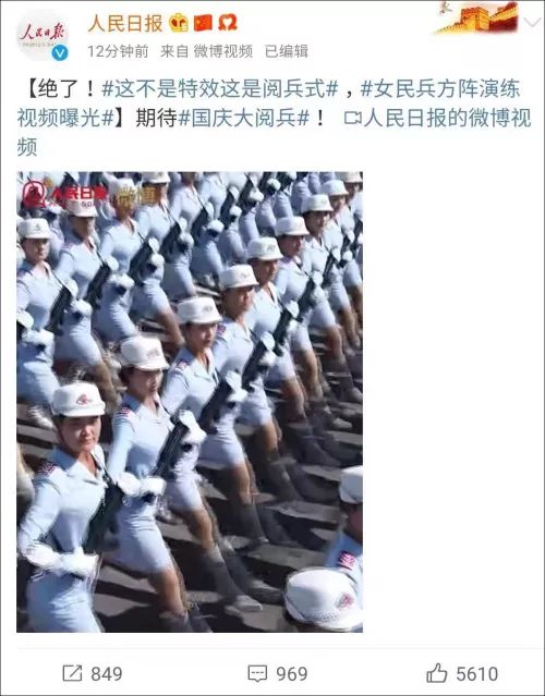 9月25日晚上,人民日报在微博上传了一段女民兵方阵进行阅兵演练的视频。这条微博还特意提醒网友们,“这不是特效,这是阅兵式”。