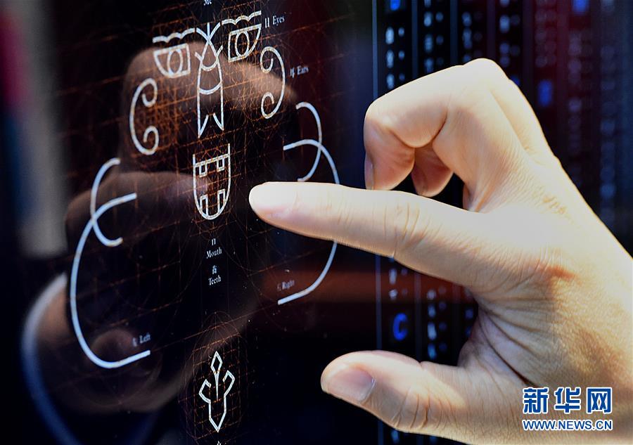 陈楠在位于清华大学的工作室内用电脑展示讲解他设计的甲骨文字绘作品(9月24日摄)。 新华社记者 李安 摄