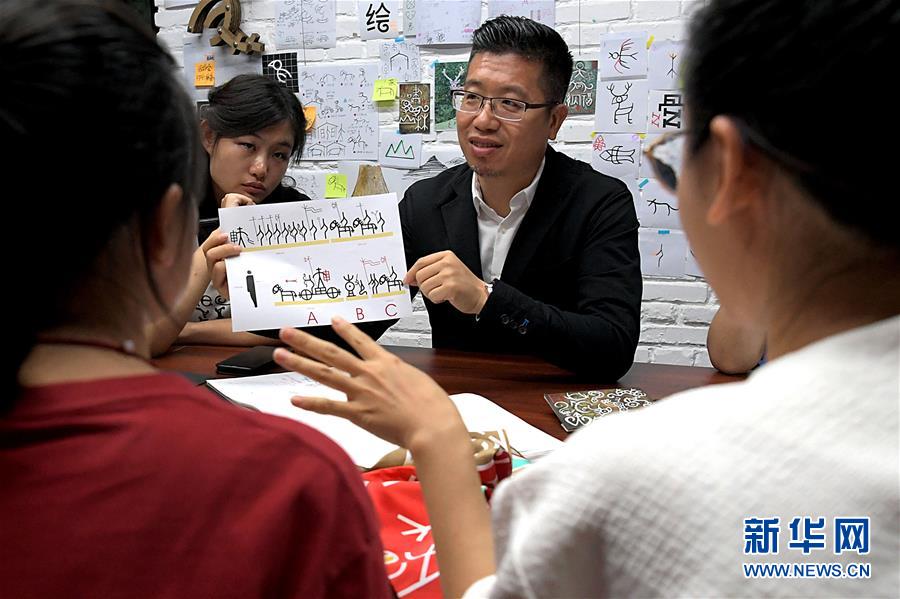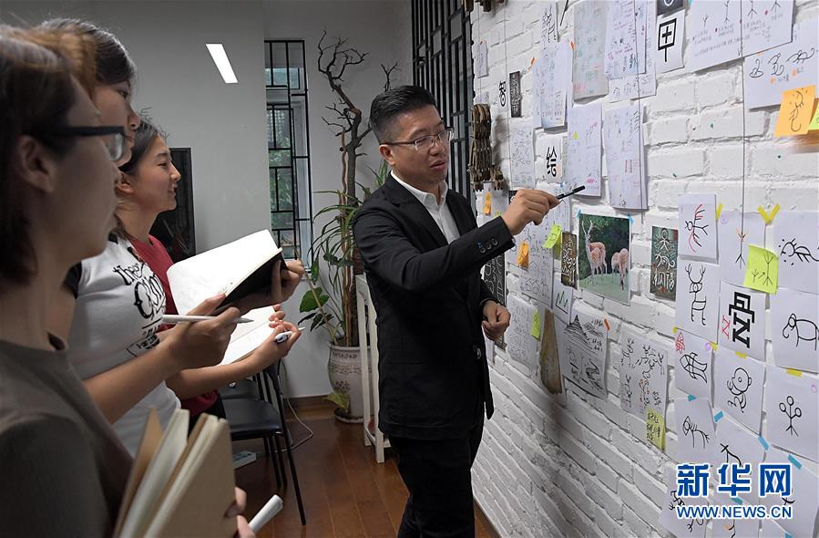 陈楠在位于清华大学的工作室内向记者讲述甲骨文表情包的创作过程(9月24日摄)。新华社记者 李安 摄