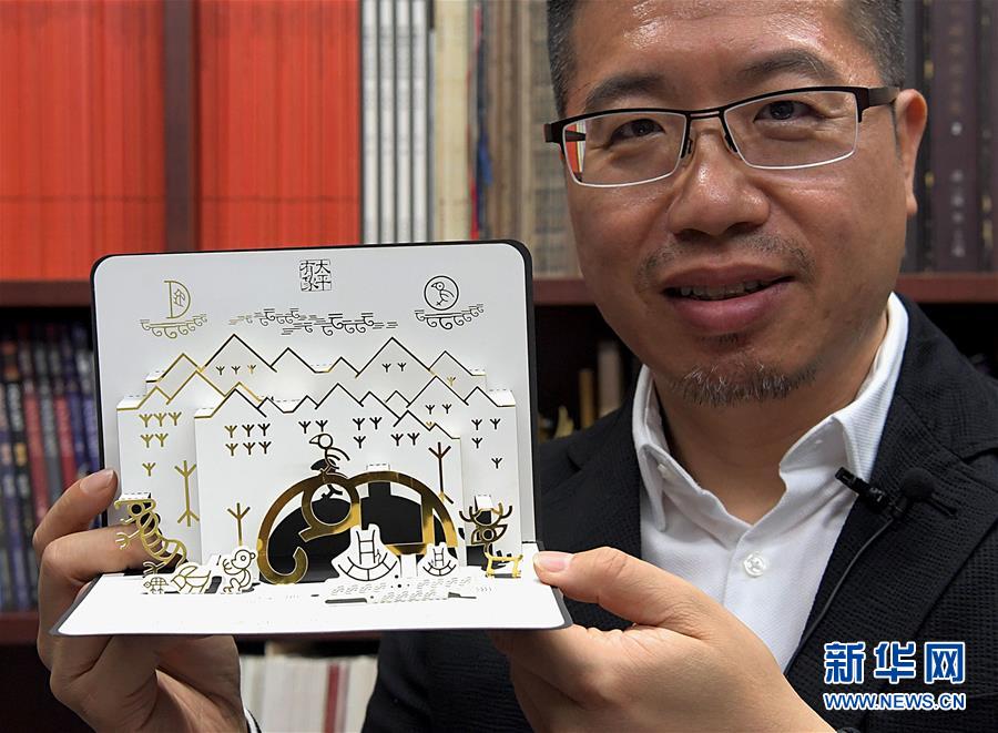陈楠在位于清华大学的工作室内展示他设计创作的甲骨文贺卡(9月24日摄)。 新华社记者 李安 摄