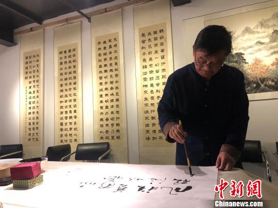 近日,收藏砚滴40余年的李治甲在甘肃兰州将数百件藏品面向公众展出。图为李治甲在展览现场挥毫泼墨。 徐雪 摄