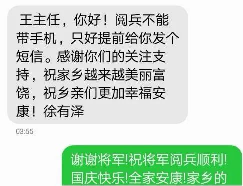 徐将军十分惦记乡亲。10月1日凌晨3时55分,他给罗店镇宣传委员王才彬发去短信:“阅兵不能带手机,只能提前给你发个短信,感谢你们的关注支持,祝家乡越来越美丽富饶,祝乡亲们更加幸福安康!徐有泽。”