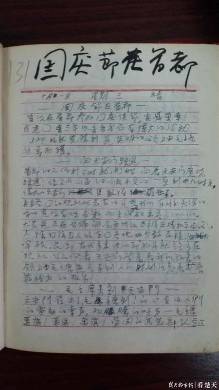武汉市著名红色收藏家姜小平在去年年初,在网上淘到了一本记录了1952年大阅兵情景的军人日记本。记者看见,红色封皮的日记本,上面用毛笔书写着主人名字韩琦,下方引有烫金字“中国人民解放军第八步校”的字样。翻阅日记内容,发现在这本大概200页、约8万字的日记本中,全程记录了其参加军训的苦与乐,情景再现了67年前的大阅兵。