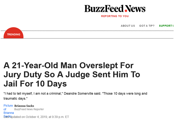 美国新闻媒体“Buzzfeed News”4日报道说,8月20日,萨默维尔被选为佛罗里达州西棕榈滩县一起民事案件的陪审员。然而,第二天上午一觉醒来,萨默维尔发现自己睡过了头,已经错过了前往法院的车。更糟的是,发觉自己要迟到后,这位年轻的陪审员并未赶往法院,也没有打电话告知院方,承认自己的这个错误。