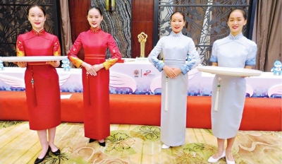 在发布会现场,多位礼仪人员身着本届军运会礼仪服装亮相,尽显中国女性的自信与风采。礼仪服装采用中国传统旗袍样式,分为青花蓝和中国红两种颜色,引导员、托盘员两种款式。服装面料采用色织提花绸,以“宋锦”的编织方式将“海水江崖”纹呈现在衣袖上,腰间配以玉器流苏挂件,在充分展现中华文化特色的同时,也表达了“有朋自远方来不亦乐乎”的好客之道。