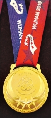 在奖牌的制作中,则运用到武汉特色的非物质文化遗产项目。挂带正面以汉绣工艺呈现武汉军运会会徽,背面绣出长江、汉江的水纹图样。