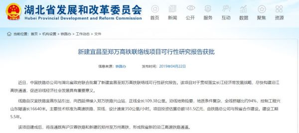 目前,宜昌至郑万高铁联络线已经完成了可研批复,争取年内开工建设。