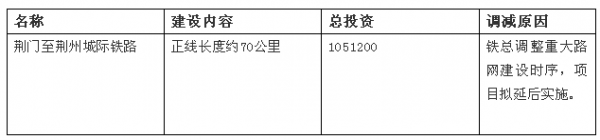 据了解,2018年8月,湖北省发改委发布了《省发展改革委关于下达2018年省级重点建设计划中期调整的通知》,将荆荆高铁从年初印发的2018年省级重点建设计划中调出,调减原因是:铁总调整重大路网建设时序,项目拟延后实施。