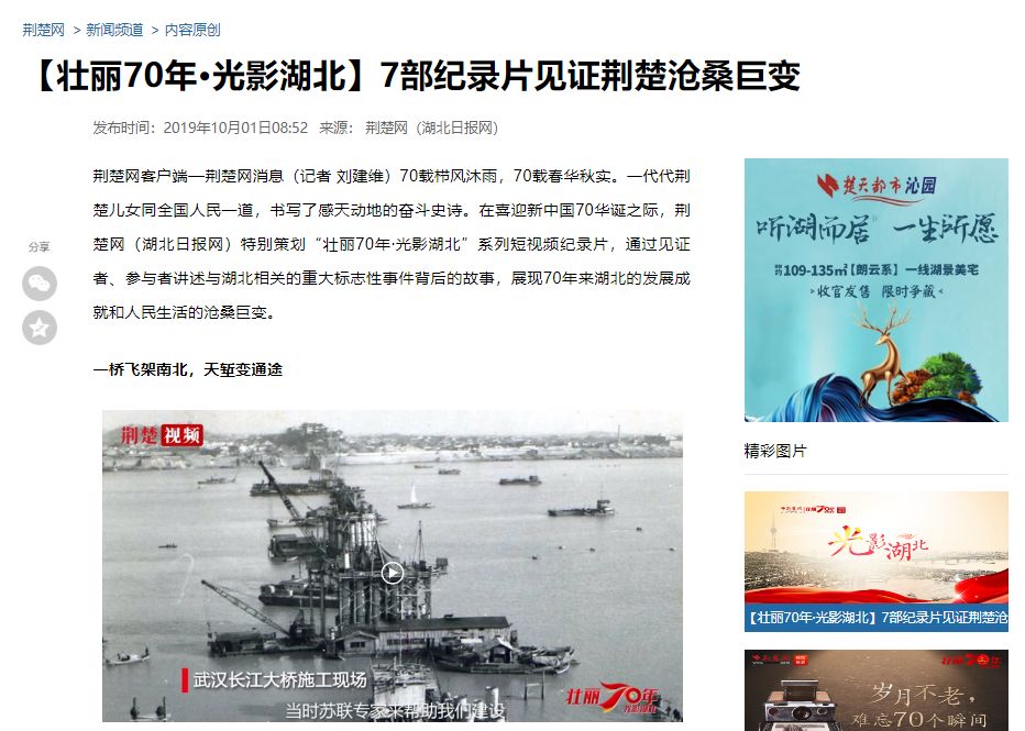 9月30日,这组纪录片全部推出以后,我们又迅速制作了集合式报道《7部纪录片见证荆楚沧桑巨变》,进行摘要归纳和线索式推荐,反映整体策划思路和全貌,并制作PC端和手机端专栏,在国庆期间二次传播。同时,还制作推出了H5《壮丽70年·光影湖北》,方便用户在手机端进行浏览、传播。