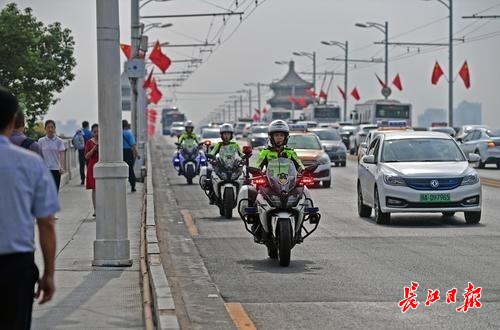 汉警快骑女子队队员骑摩托车在长江大桥路段巡逻(资料图)。记者史伟 通讯员应后威 摄