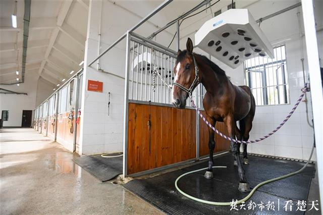 马房门口,一匹马昂着头、一步不动地享受着淋浴。工作人员卫志强揉洗完马额前的鬓毛,又用刷子仔细刷洗马蹄。他说:“每只运动完回家的马都要先洗个澡。既可以降温,也有助于保持卫生。”
