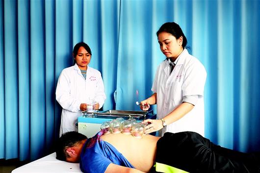 图为:泰国姐妹给患者拔火罐。(视界网 谭爱华 摄)