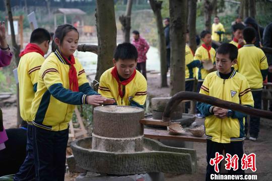 育才学校学生在“石磨豆花”课程中进行劳技探索。受访者供图
