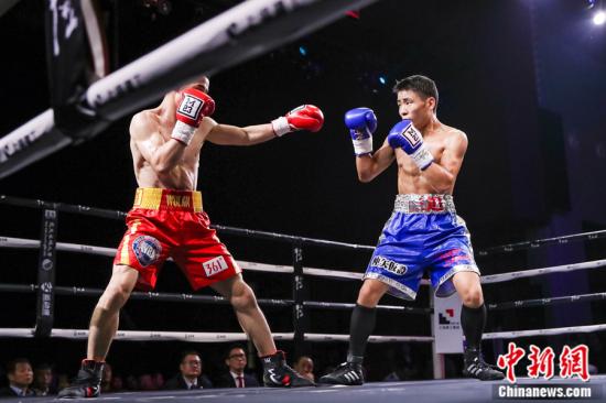 当晚头条主赛,中国拳手乌兰(左)仅用5回合便将日本对手田中公士KO。 主办方供图