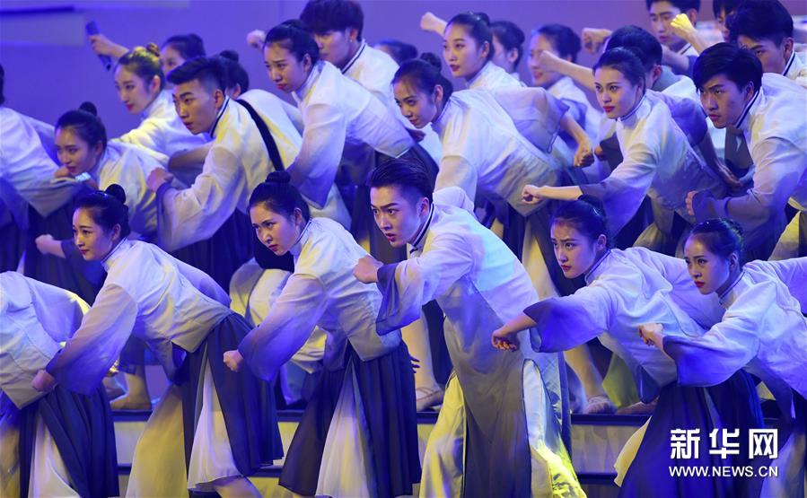 10月17日,演员表演音舞诗画《一路向南》。当日,南开大学建校100周年纪念晚会在南开大学八里台校区体育馆举行,南开大学师生员工、海内外校友及社会各界友好人士齐聚一堂,礼赞南开大学100年不平凡的光辉历程。晚会共七个乐章,以歌舞、交响乐、诗朗诵等形式讴歌南开百年历程与荣耀。新华社记者 李然 摄