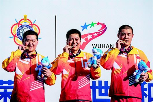 图为:中国队3位选手登上领奖台“尝”金表示庆贺。(湖北日报全媒记者魏铼摄)