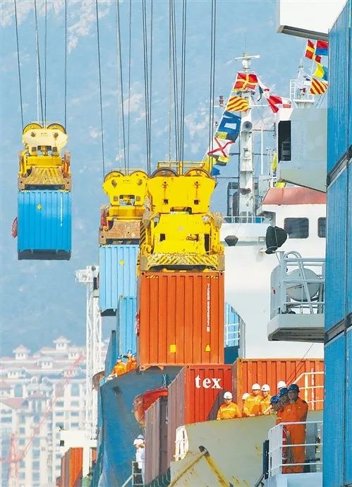 ↑10月17日,山东烟台港国际集装箱码头,岸桥为“海上巴士”航线的船舶装载集装箱。 当日,山东港口集团环渤海集装箱“海上巴士”正式通航。 “海上巴士”航线的开通将充分发挥“陆海铁联运”“散集双向”等优势,促进环渤海地区集装箱和散货运输环节无缝衔接。 唐 克摄(中经视觉)