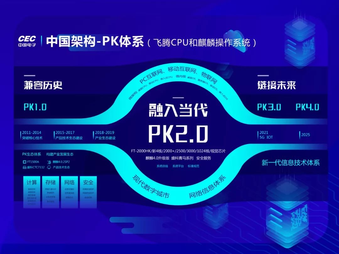此次世界互联网大会,中国电子PK 2.0体系首次全新亮相。 该体系是由飞腾2000系列CPU与之配套的麒麟4.02系列操作系统,以及盛科青马系列交换芯片,辅之以复杂信息系统场景,兼容移动、云、(虚拟化)、大数据和物联网、人工智能等最新技术的产品组合生态。