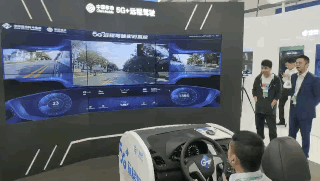 走进展区,巨大的三折屏,酷炫的操作台,这就是5G+远程驾驶。驾驶者只需要坐在操作台上操纵设备,远处的车辆就能随之开动,5G的高速率将路况、车况等信息实时回传,帮助驾驶员及时作出判断。