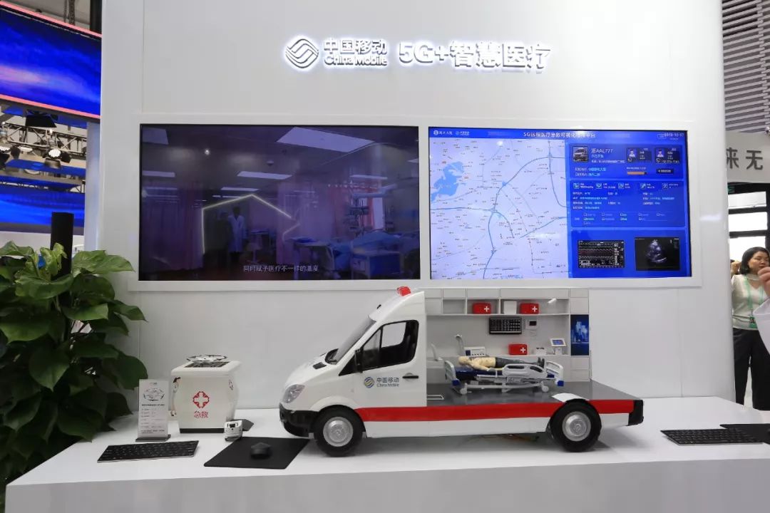 在5G+智慧医疗展台,通过5G网络实现救护车和专家实时高清视频传输,实施“远程B超”、“远程急救”等创新应用,还配合5G无人机及时运输样本、物资,极大提高了救援效率。