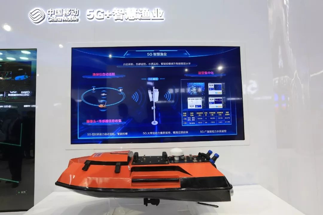 在5G+智慧渔业展示的5G无人船,5G的超低时延让它可以做到自动巡航、智能投喂,超大带宽可以实现鱼群监控,超大连接可以实现水质监控。