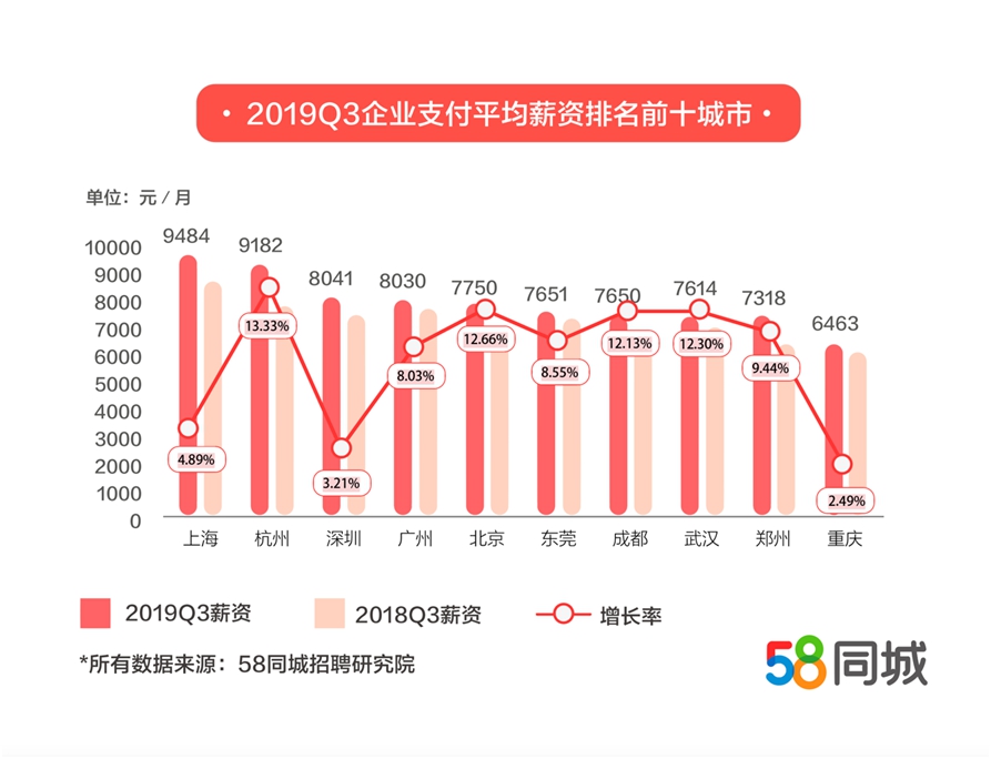 报告表示,今年三季度,企业支付薪资均有一定程度上涨。其中,上海企业平均支付月薪达9484元,排名第一,其次是杭州、深圳和广州。上海是全国传统的经济中心,人均GDP突破2万美元,优秀人才为上海企业创造了巨大的财富,而企业也将这些价值以高薪形式返还给人才。