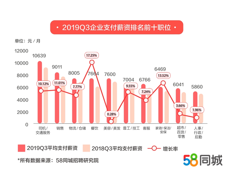 报告显示,今年三季度,各类职位的企业支付薪资均有所增长。其中,司机/交通服务的企业支付月薪最高,达到10639元,同比增长10.12%。销售、物流/仓储企业支付薪资紧随其后,分别为9011元和8005元。随着城市“铁水公空”路网的完善,以及“互联网+”在交通领域的运用,司机职位的收入水平持续提升,而与之相关的物流/仓储行业也快速发展,让从业者能获得较高收入。