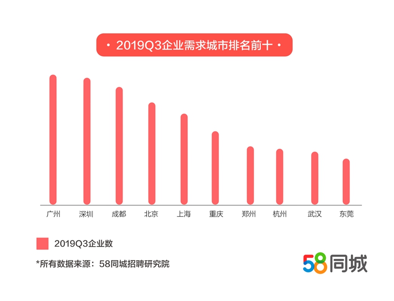 报告显示,今年三季度,企业招聘最活跃的城市为广州,其次是深圳和成都,其中深圳比上季度提前了一个位次。随着粤港澳大湾区建设的推进,广州、深圳聚集了大量优质企业,带来了丰富的招聘需求,致使企业招聘在这些地区十分活跃。