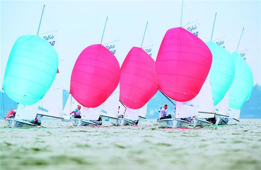 图为:10月22日,军运会帆船项目男女混合470级比赛在东湖水域激烈进行。(湖北日报全媒记者柯皓摄)