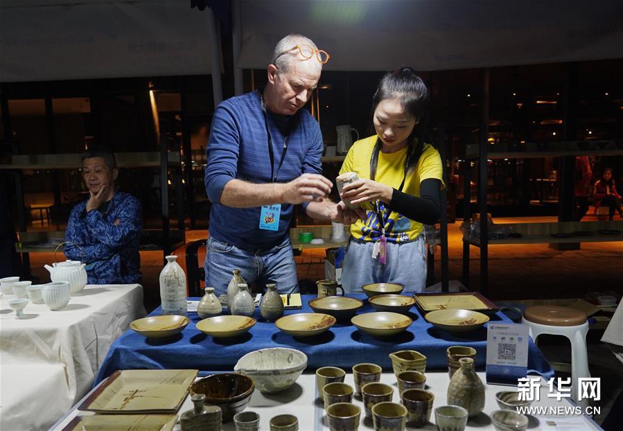一名外国陶瓷艺人在景德镇陶溪川“春秋大集”上与中国陶瓷艺人交流讨论(10月17日摄)。 新华社记者 周密 摄