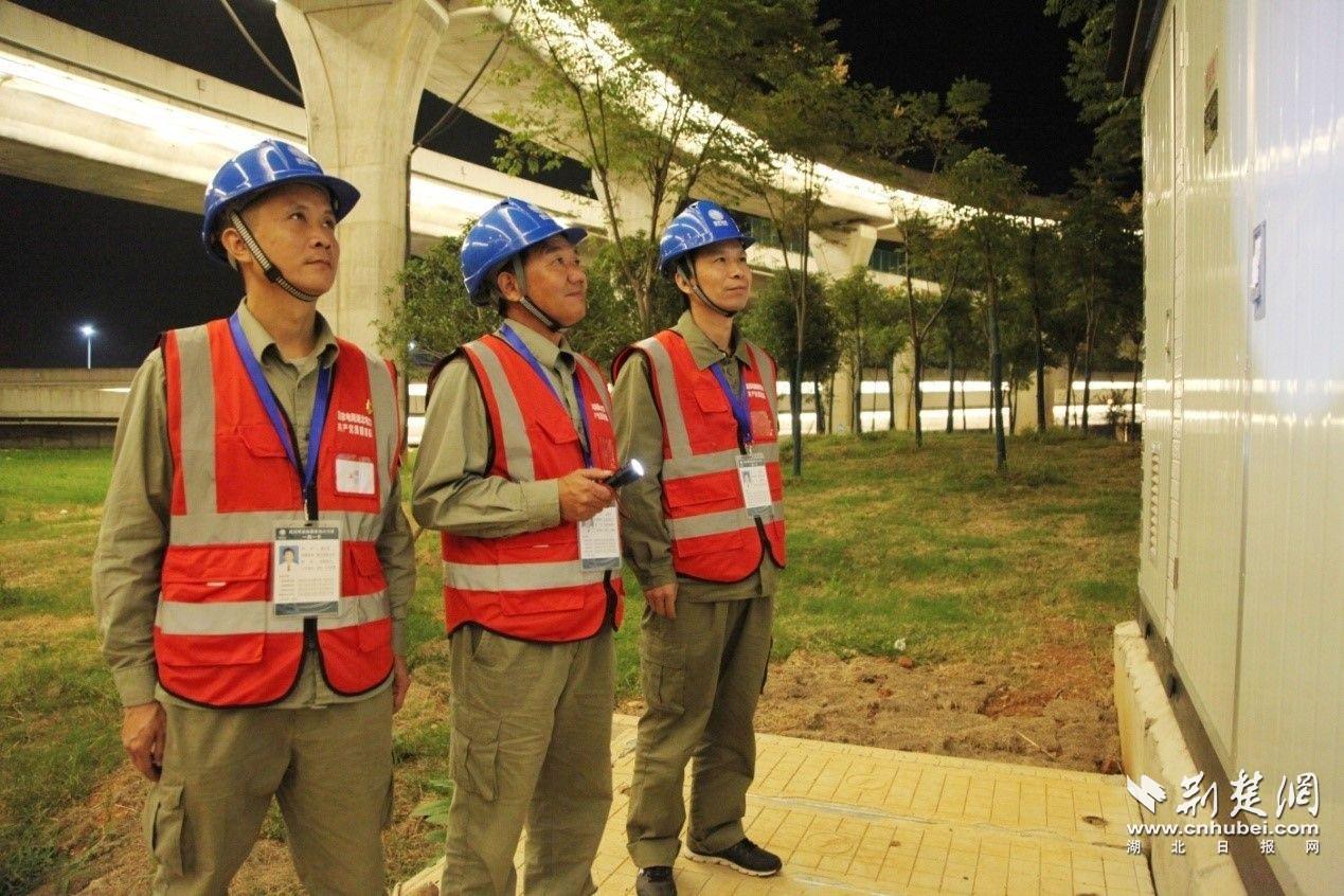 嘉鱼县供电公司退伍军人保电队员在夜间检查用电设备。(通讯员供图)