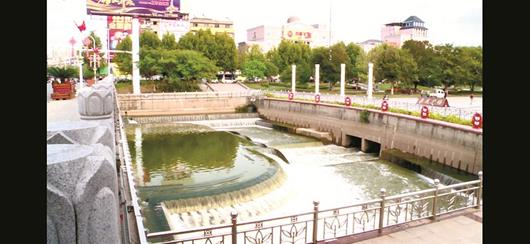 荷花广场是洪湖市城区的主体公园, 广场地下有一个直径约6米, 长800米的地下涵洞, 用来连通内荆河和长江。每年秋冬季节, 长江进入枯水期, 而内荆河水充盈, 水位相差约3米, 设计者利用水位差在涵洞入口处建造了一个瀑布景观。每当长江岸边的老闸开闸放水时,涵洞入口处便瀑布飞溅, 鱼儿跳跃。