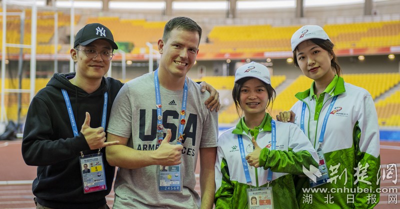 赛场内气氛友好,赛场外,各国记者也收获了友谊。美国空军随队记者James Crow第一次来中国,他告诉记者,武汉给他很多很美好的感觉,这里的人脸上总是带着笑容,非常友好,食物也很好吃,地铁交通十分便捷,也很干净漂亮。James Crow一有空就会跟中国的记者、志愿者聊天,并交换徽章,他表示回国后,会将这里美好的一切,告诉身边的朋友,这次军运之旅将是他此生难忘的回忆。