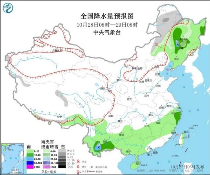 明天,南方的降雨范围将会缩减,但东北一带雨雪将会增多,内蒙古中东部、黑龙江西部、吉林西部与中东部、西藏北部和南部、川西高原等地的部分地区有小到中雪或雨夹雪。内蒙古东南部、东北地区大部、西藏东部、江南大部、西南地区南部、华南大部、海南岛、台湾岛等地的部分地区有小到中雨。其中,吉林中西部、云南南部等地的部分地区有大雨(25~40毫米)。