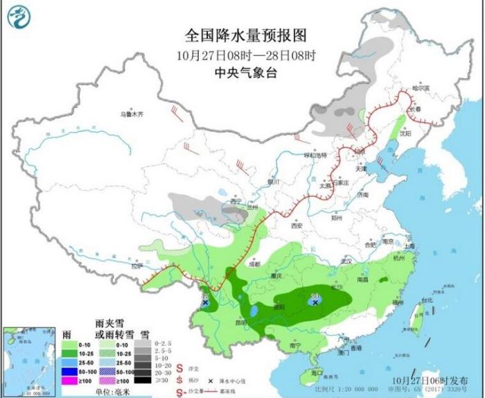 中国天气网讯 今天(27日)起,新一轮冷空气开始影响我国,淮河以北大部及青藏高原东部将降温4~6℃,局地降温幅度可达8~10℃。而降雨则主要出现在南方,西南阴雨持续,江南华南也将有小到中雨。