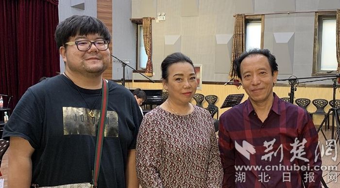 军运会颁奖仪式音乐主创人员合影(从左到右:王航、周曼丽、黄立杰)。(通讯员供图)