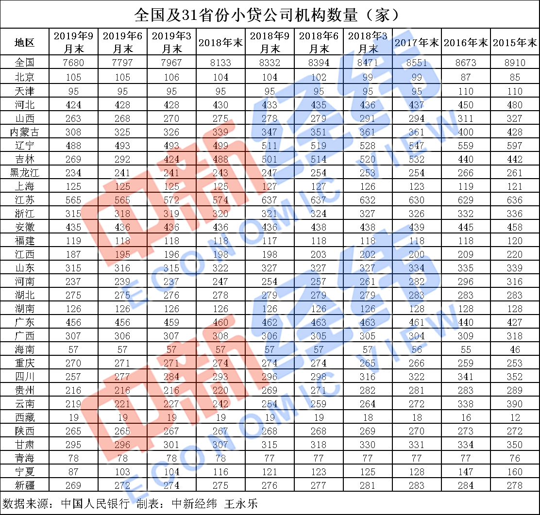 央行数据显示,截至2019年9月末,全国小贷公司数量年内减少453家,较2018年9月末的8332家减少652家。此前的2016年、2017年及2018年分别减少237家、122家和418家。