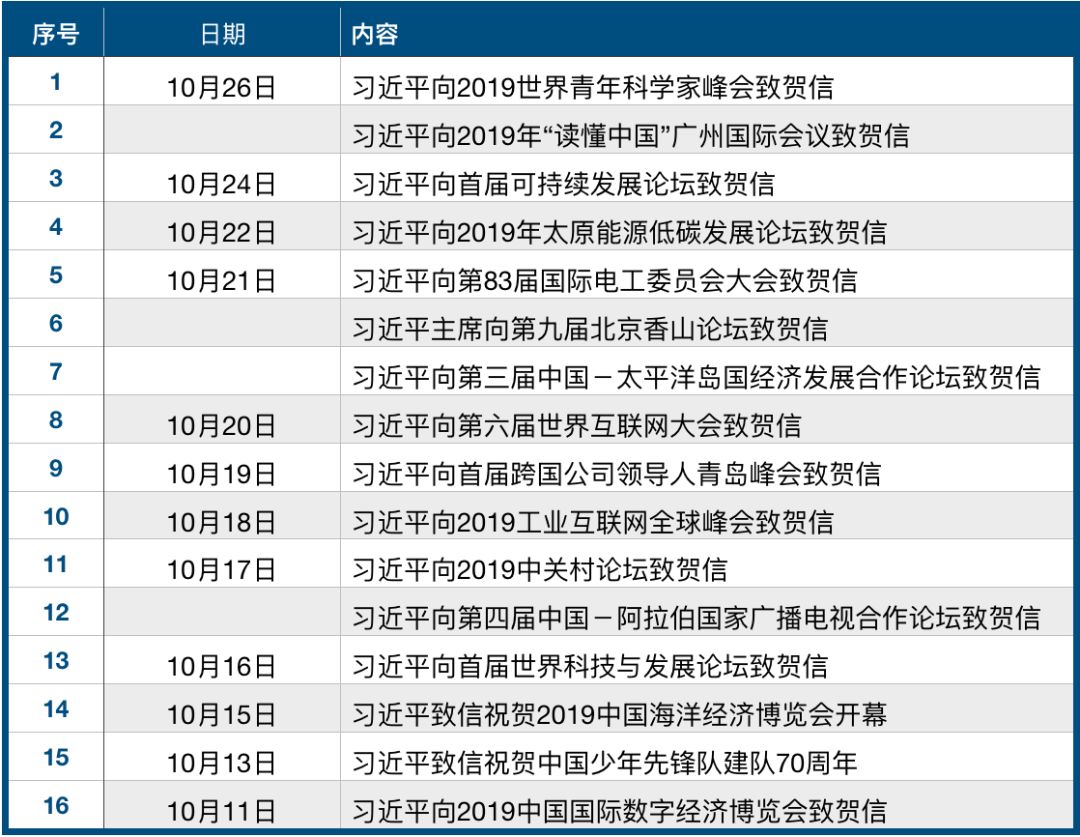 十月以来,在国内和国际舞台上,多场重要的会议、论坛、活动先后召开和举行,向世界传递着前沿、主流的声音。对于这些活动,习近平主席也给予了高度关注,根据《新闻联播》刊播的消息统计,从10月11日到26日16天的时间里,习近平共发出了16封贺信,最多的一天连发3封贺信。