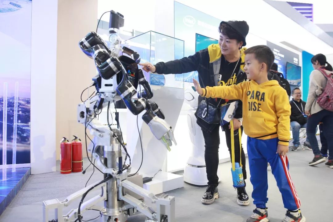 △2019中关村论坛上,人工智能、5G、工业互联网、脑科学技术等热门议题被人们频频讨论。一批重大创新成果面向全球发布,展示着来自全球最新最前沿的科技成果。图为“中关村国际前沿科技成果展”现场,参观者与服务型机器人互动。