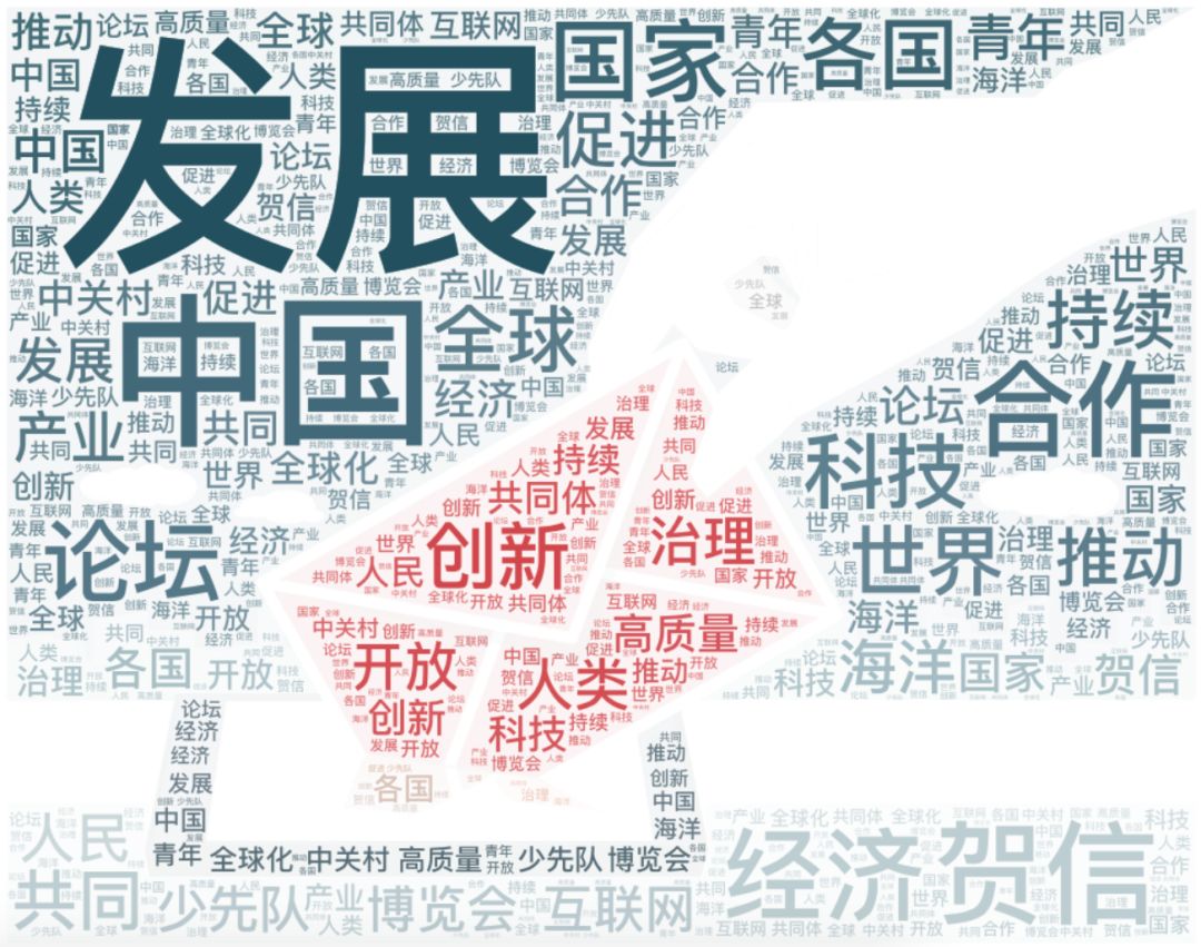 通过对这16封贺信的文本进行分析,我们发现,发展、中国、合作、经济、科技、创新成为了习近平提到的高频词。