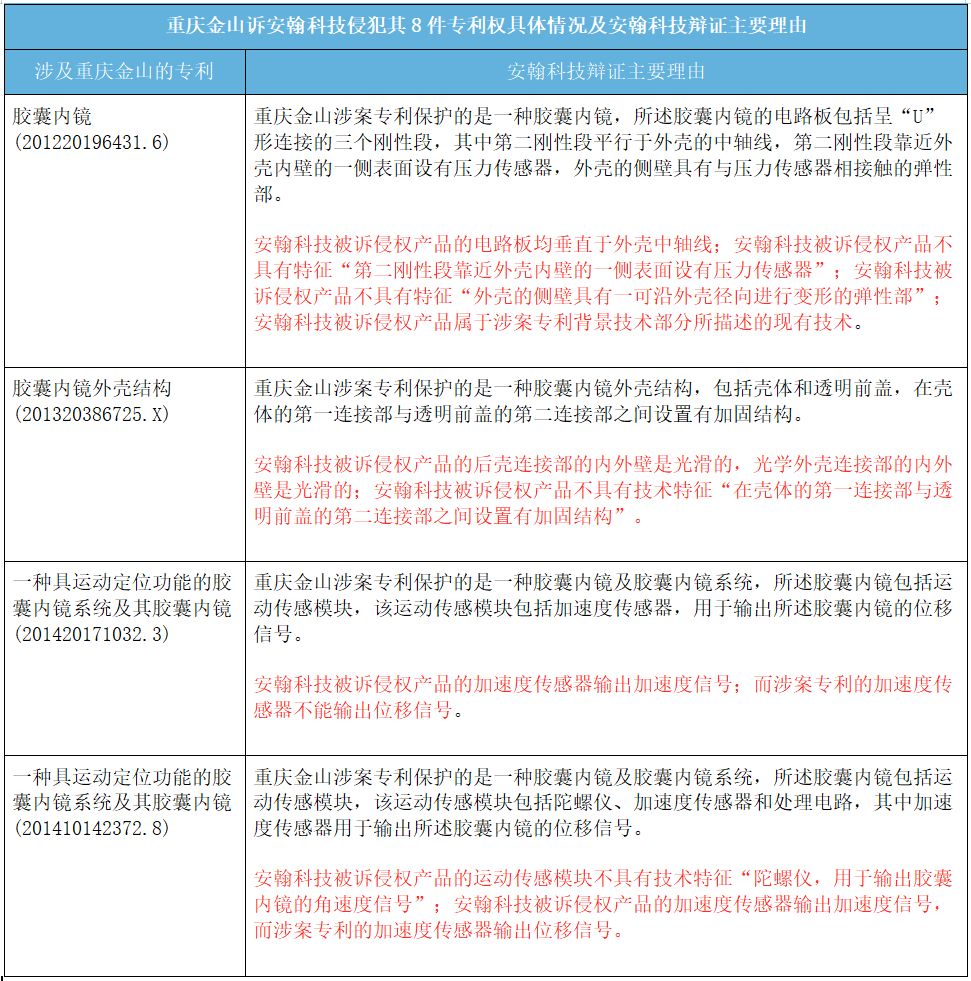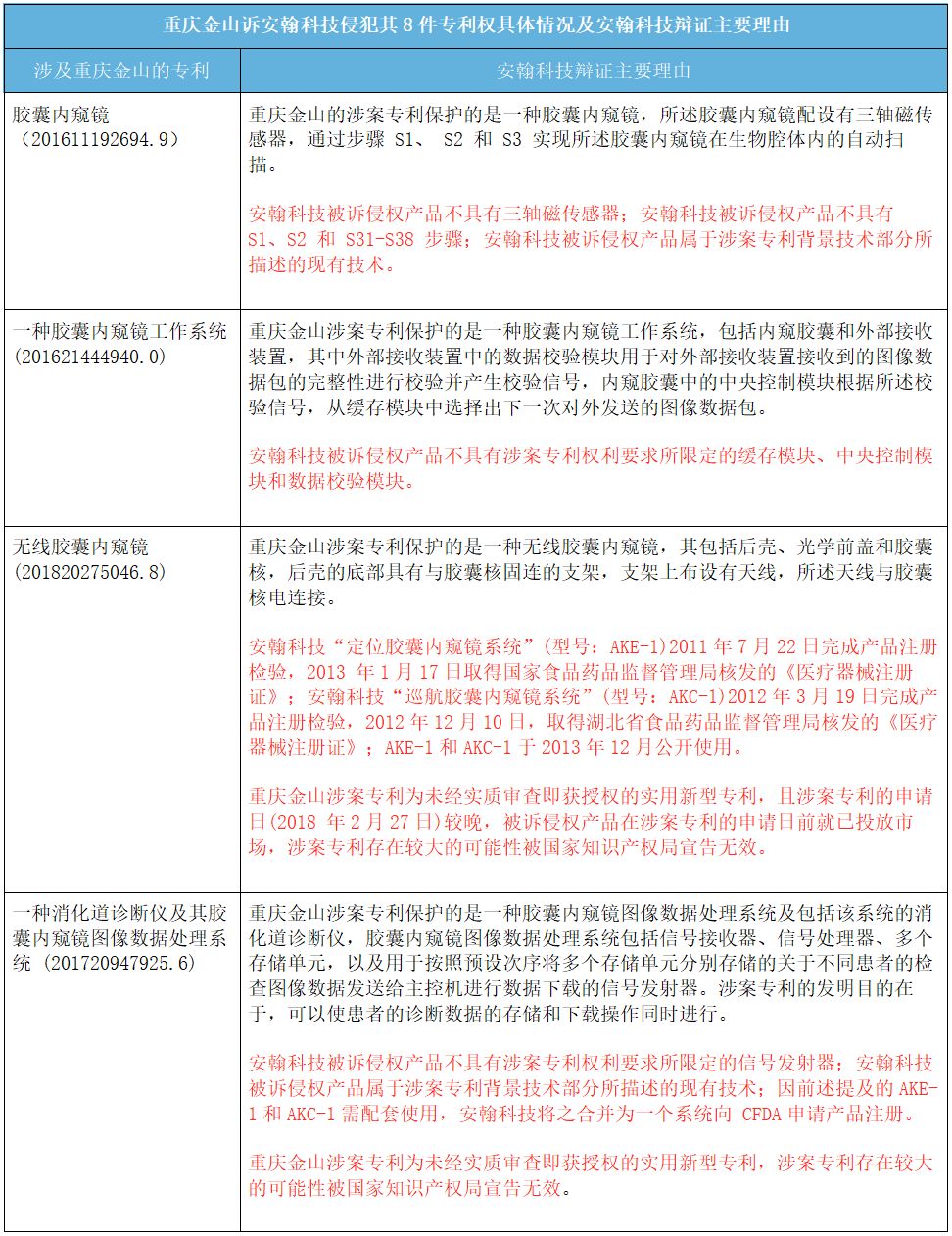 此后,安翰科技还向国家知识产权局提起“重庆金山诉其专利侵权的8件专利无效”,以及“重庆金山另外7件专利无效”。作为反击,今年10月,重庆金山也对安翰科技与胶囊有关的9件专利提起了无效申请。