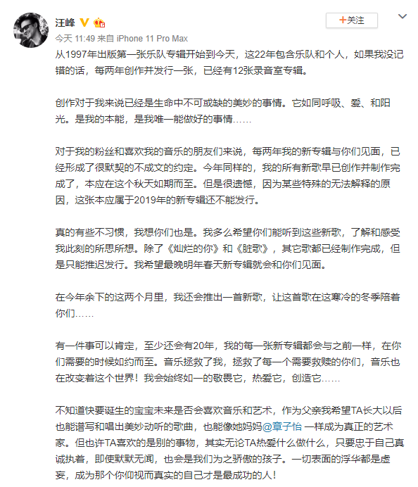 汪峰发布长文