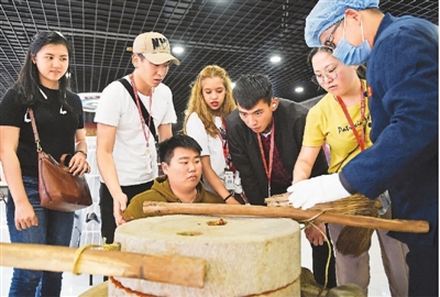 10月31日,山东理工职业学院30多名留学生来到位于山东省济宁市的广育堂国药有限公司参观体验,感受中医药文化。图为留学生在体验石磨碾制药材。朱峥摄