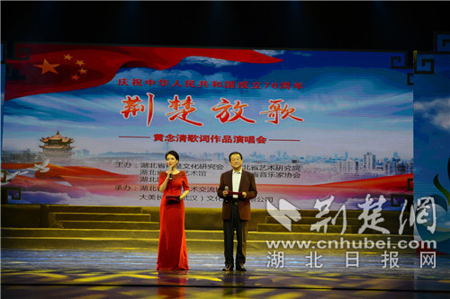 荆楚网客户端—荆楚网消息(通讯员杜旭东、王永娟)“幸福是文明绽放的花朵,幸福是创造播撒的欢乐。”10月31日,湖北剧院内群星璀璨,幸福欢歌。由湖北省荆楚文化研究会、湖北省艺术研究院、湖北省群众艺术馆、湖北省音乐家协会、湖北剧院联合主办,湖北省文化艺术交流协会承办的“庆祝中华人民共和国成立70周年,荆楚放歌——黄念清歌词作品演唱会”倾情上演。